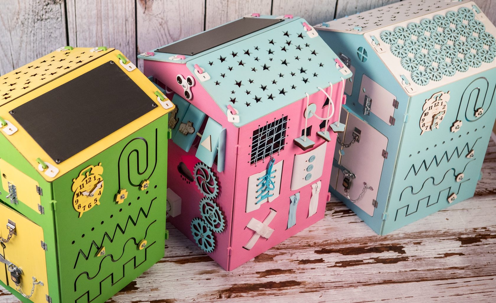Основа: БизиДомик изготавливается из высококачественной фанеры. Все лаки и краски, которые используются при покраске, высшего качества и только на водной основе, безопасной для детей. БизиДомики абсолютно безопасны для детей, в них нет саморезов, а все элементы держатся на заклепках.